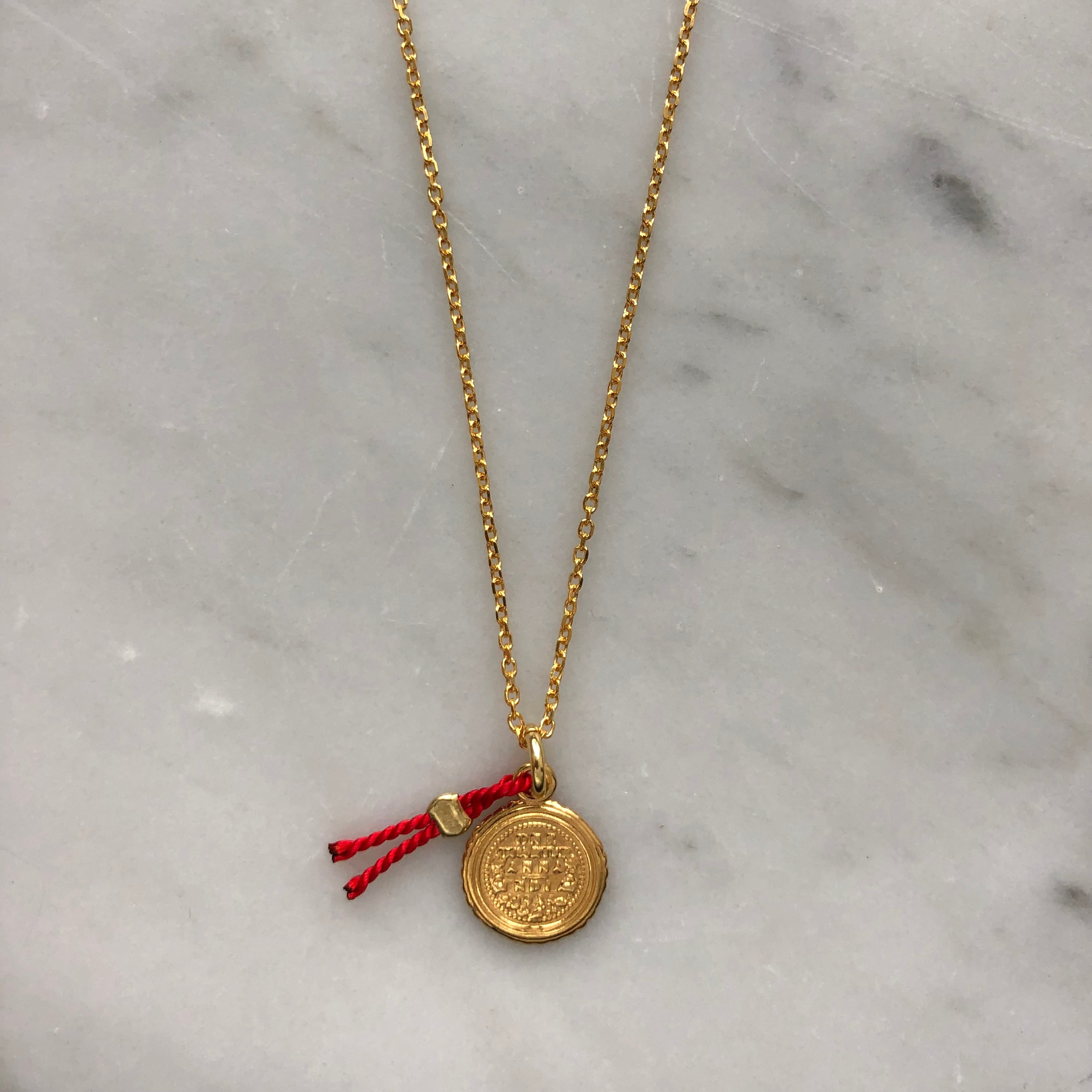 Sztywna obręcz o okrągłym przekroju, zakończona oczkami, przez które przeciągnięta jest regulowany, czerwony sznureczek. Długość można dostosować dzięki supełkowi przesuwnemu. Na końcach nici umieszczone są dwie pozłacane kulki ze srebra. Lekka forma, łącząca szlachetne materiały z elastycznym dopasowaniem.