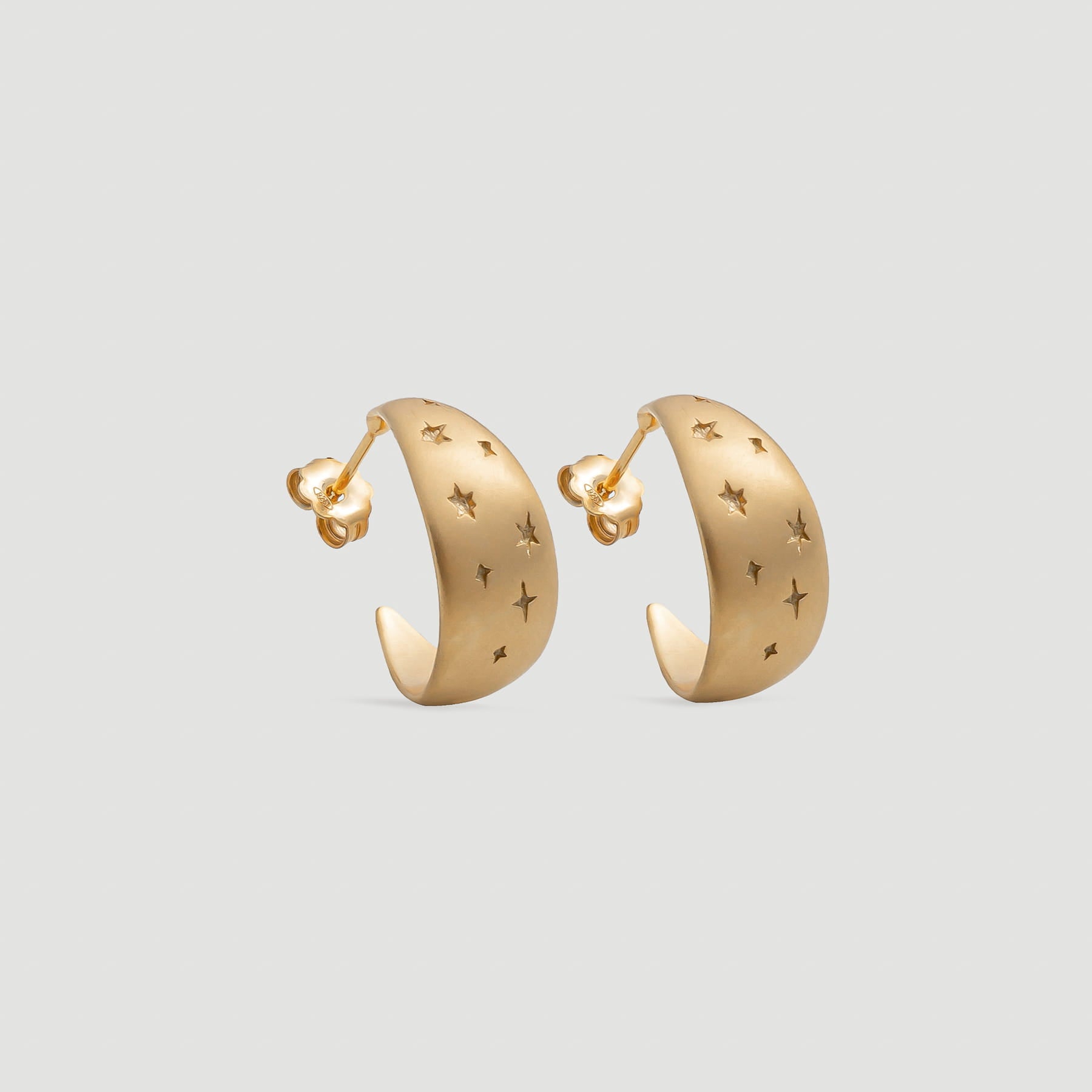 Kolczyki Estrella mają rzeźbiarską formę z odrobiną wszechświata - ich powierzchnię zdobią wytłoczone gwiazdy — Złote wykończenie i półokrągły kształt sprawiają, że noszą się lekko, ale z wyrazem.