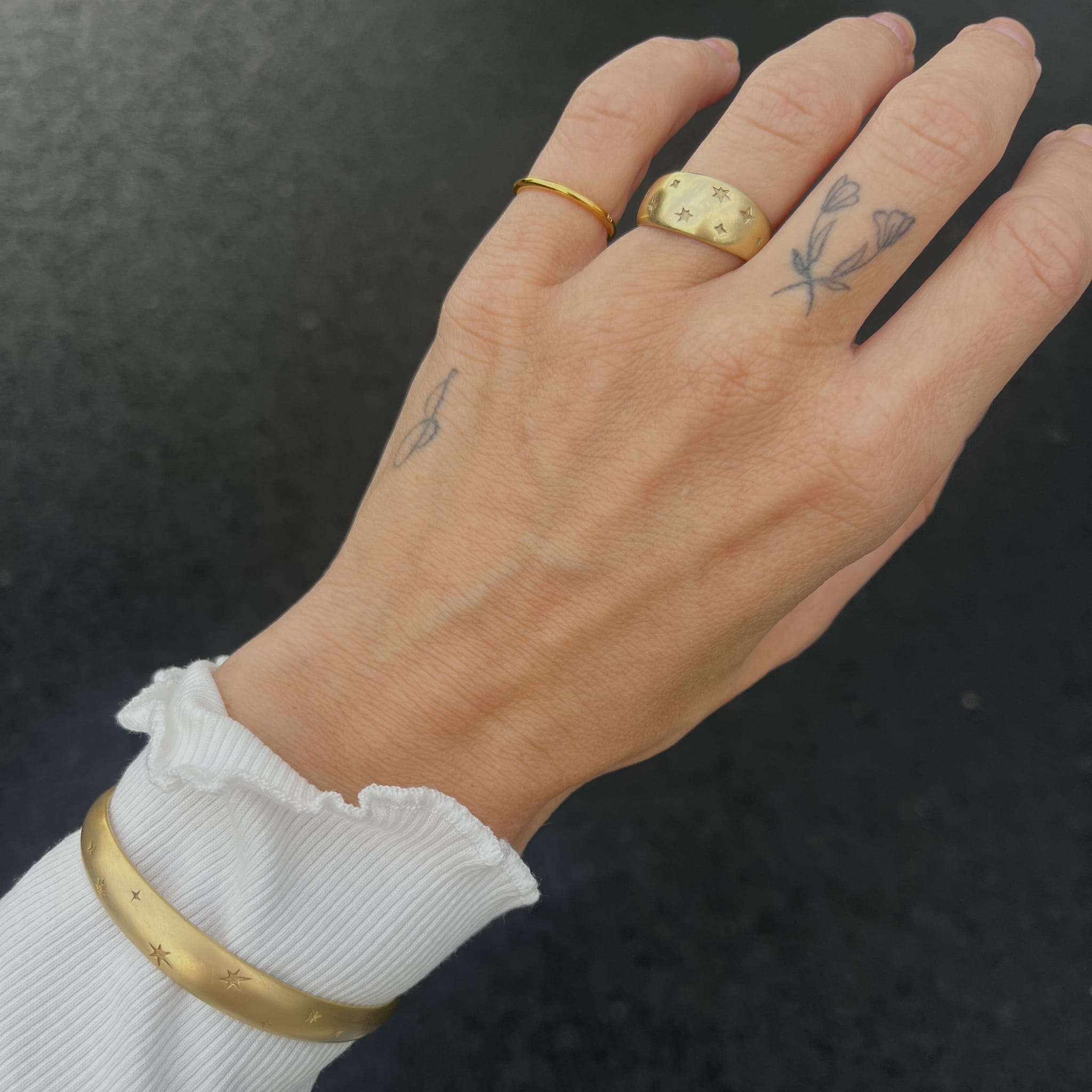Złoto, które zakwita. Kolczyki Flores łączą opływową, klasyczną formę z subtelnym kwiatowym wzorem wtopionym w powierzchnię. Nie są dosłowne — raczej przypominają florystyczną impresję niż ogród z pocztówki. To biżuteria dla tych, które cenią detal i miękkie kontrasty: światło i cień, prostotę i zmysłowość.