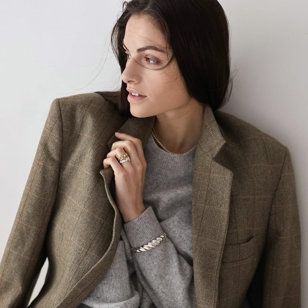 Dwie gładkie, wypolerowane kule osadzone na otwartym łuku tworzą rzeźbiarską, ale lekką formę. Dzięki otwartej konstrukcji można subtelnie regulować przestrzeń między kulami — nadając pierścionkowi nowy rytm, oddech, gest.