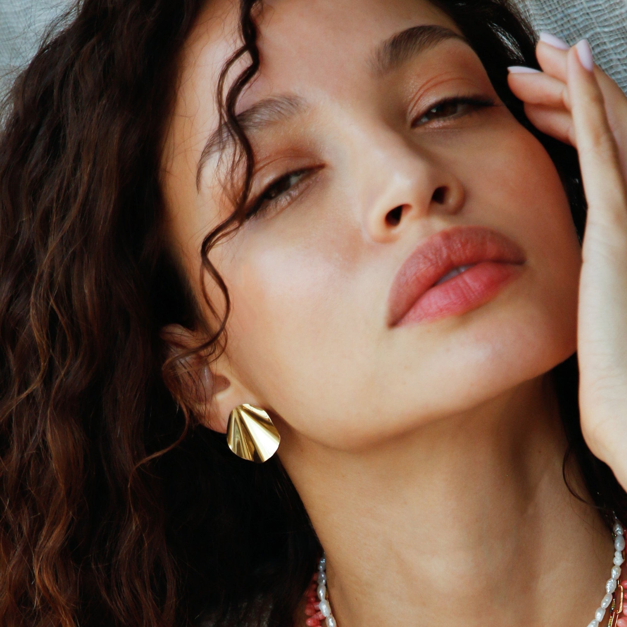 Kolczyk w kształcie półkuli, wykonany ręcznie ze srebrnej blachy próby 925; jedna strona wypukła, o połyskującej srebrnej powierzchni, druga płaska, z osadzonym sztyftem.