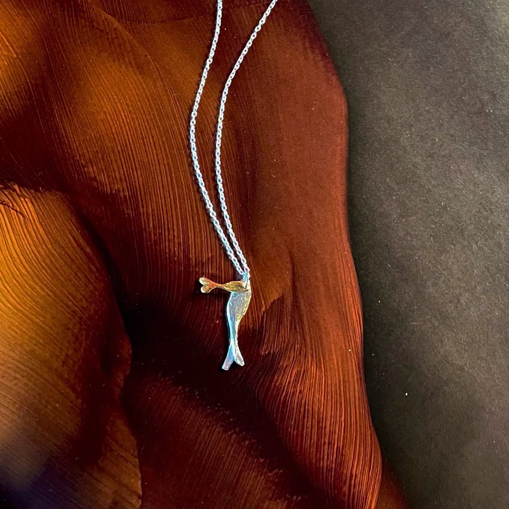 Naszyjnik wykonany ręcznie ze srebra próby 925, z zawieszkami w formie dwóch stylizowanych ryb. Większa rybka pokryta warstwą złota 24K, mniejsza zachowuje naturalne, polerowane wykończenie srebra. Obie zawieszki mają nieregularną, ręcznie fakturowaną powierzchnię, która nadaje im organiczny charakter. Zawieszone są na delikatnym pozłacanym łańcuszku typu Ankier o długości 85 cm, zakończonym klasycznym zapięciem federing.