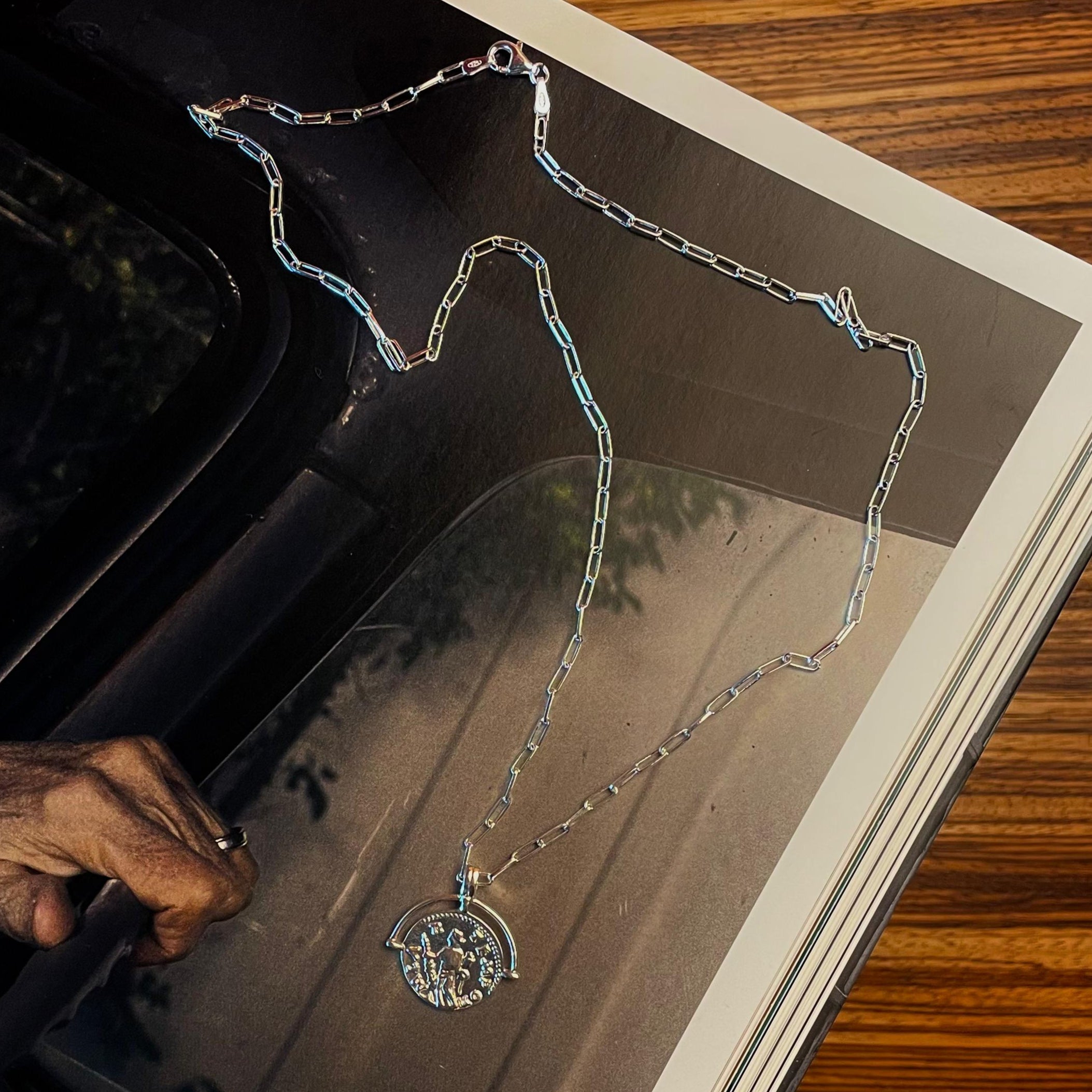 Naszyjnik w całości wykonany ze srebra próby 925 pokryty warstwą 24-karatowego złota. Wisiorek to oprawiona w półkoliście ramie replika monety z profilem rzymskiego cesarza. Zawieszony na efektownym, wydłużonym łańcuchu typu paperclip o długości 55 cm. Całość zapinana na klasyczne zapięcie typu federing.