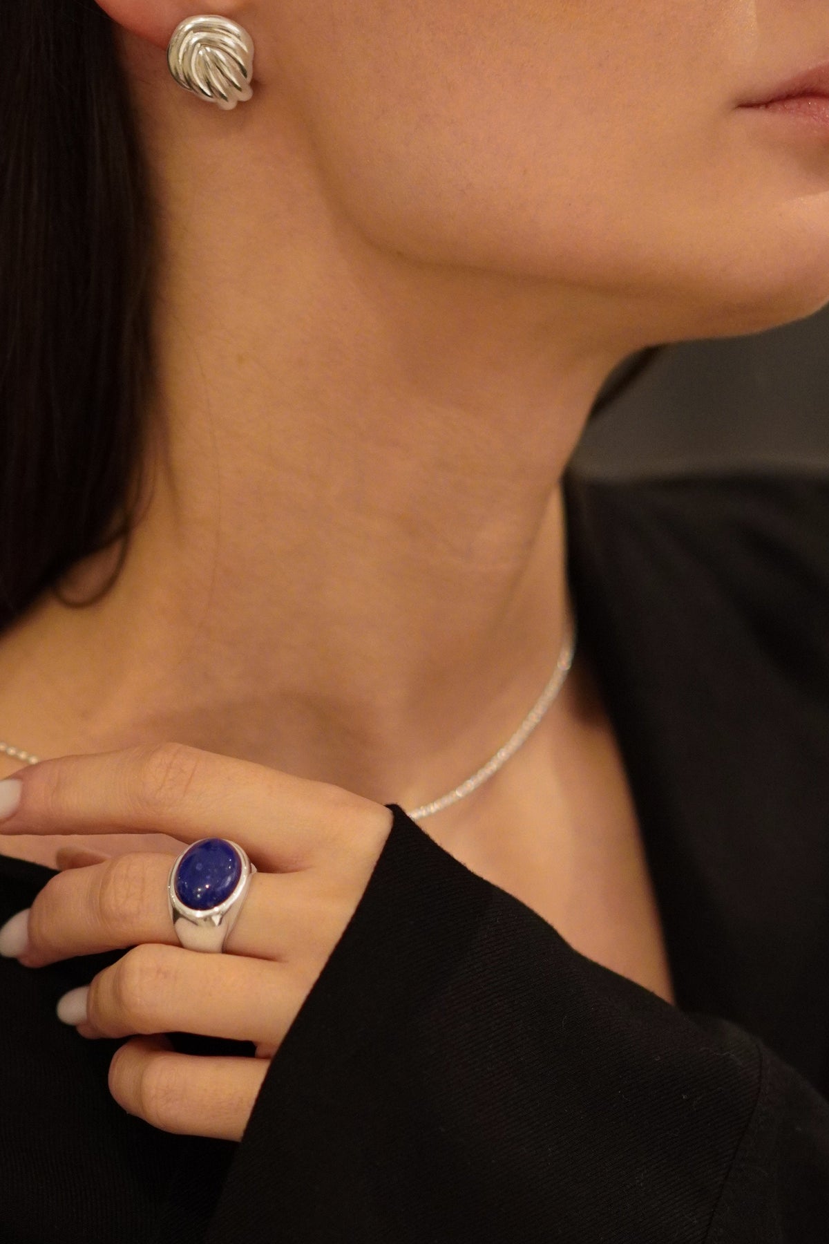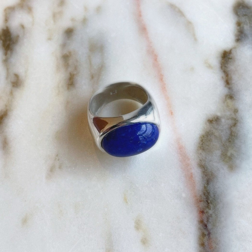 Grand Nuit – masywna, ale wyważona forma z chłodnego srebra, w której osadzony został naturalny lapis lazuli – kamień o intensywnym, ciemnym błękicie, często przeciętym drobnymi, złotymi refleksami jak pył na nocnym niebie. Lapis od wieków kojarzony jest z mądrością i wewnętrzną pewnością – i właśnie ten nastrój wnosi do biżuterii: głęboki, szlachetny, spokojnie wyrazisty.