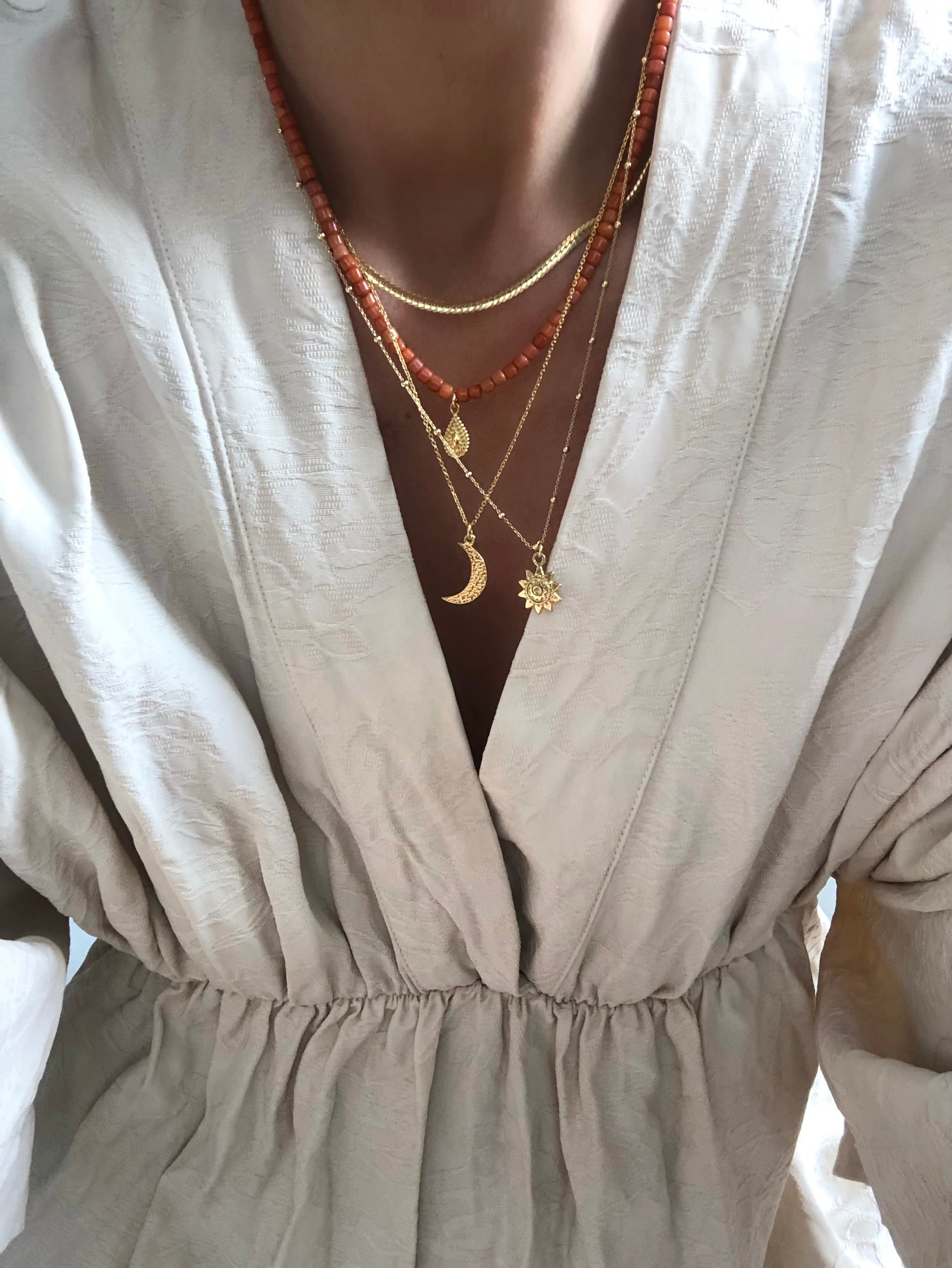 Naszyjnik wykonany z perełek hodowlanych w białym kolorze o delikatnie nieregularnych kształtach, nawlekanych na jedwabną nić z precyzyjnie wykończonym zapięciem srebrnym, pozłacanym z zawieszką słońce srebrną, pozłacaną.