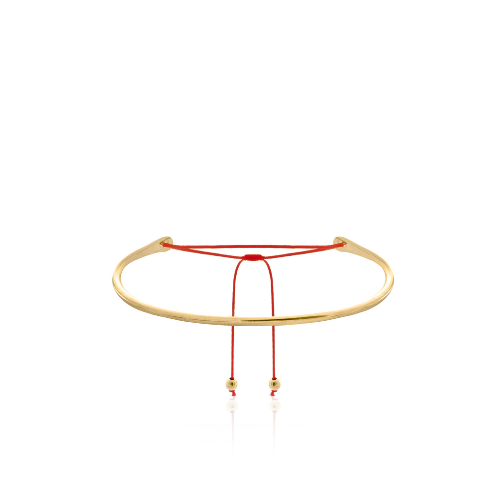 A rigid, round hoop with eyelets at the end, through which an adjustable red string is threaded. The length can be adjusted thanks to a sliding knot. Two gold-plated silver balls are placed at the ends of the string. A lightweight design combines noble materials with a flexible fit.