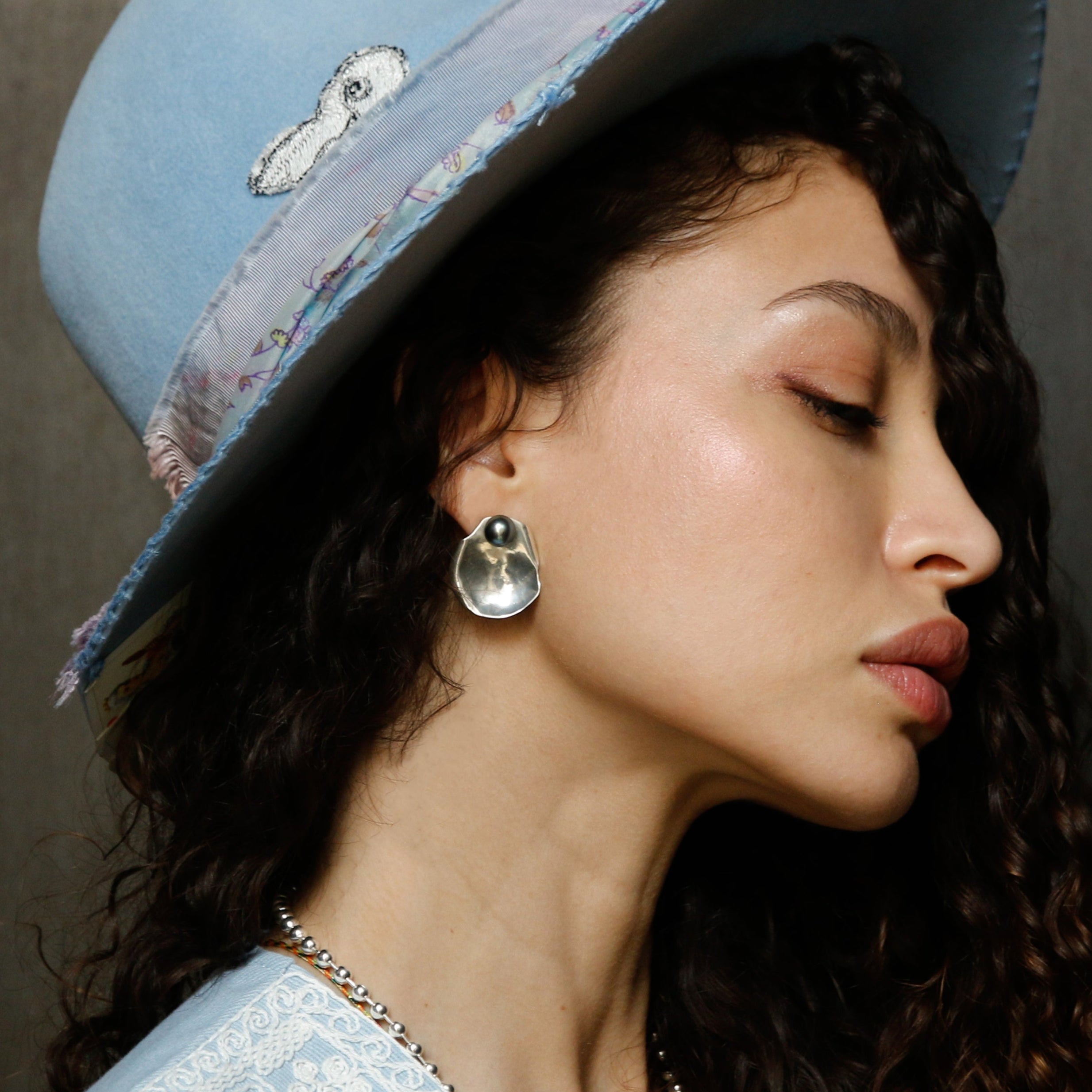 Kolczyki wykonane w srebrze próby 925. Kształt lekko nieregularnego koła o organicznej, młotkowanej powierzchni. Konstrukcja formowana ze srebra — wnętrze puste, w formie otwartego korytka. Zapięcie zatrzaskowe typu „angielskiego”.