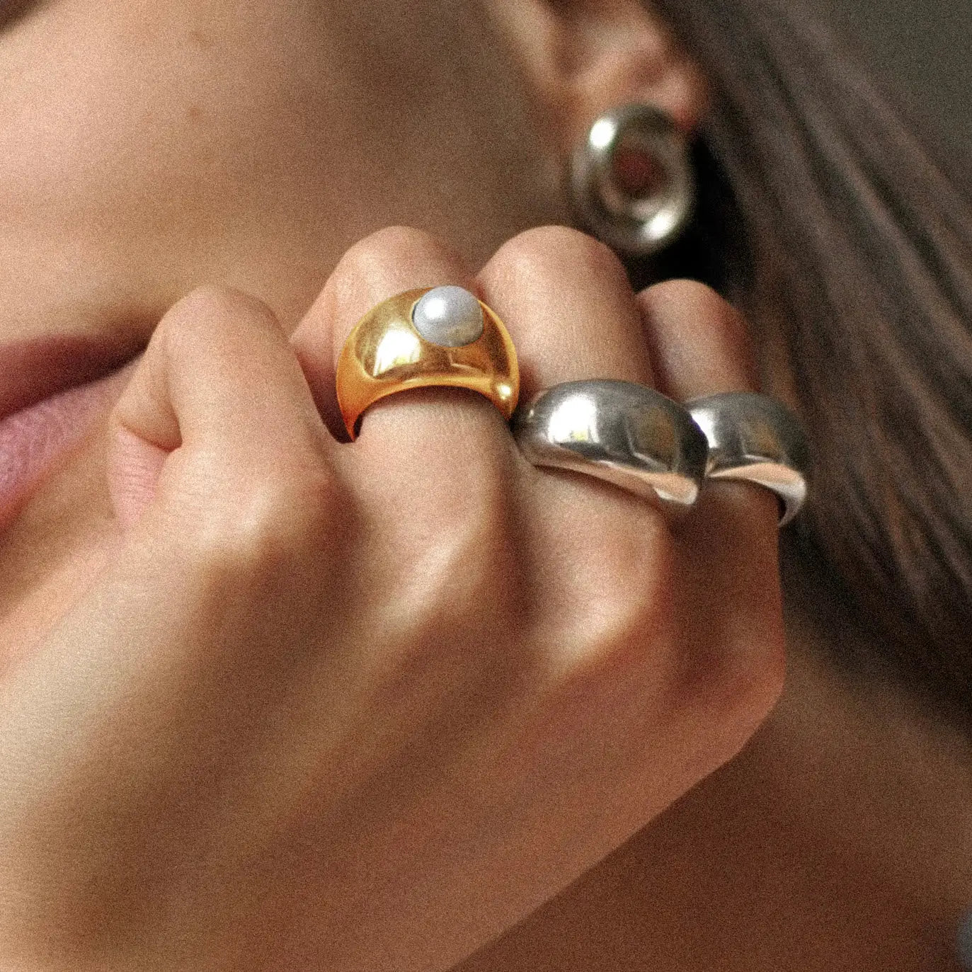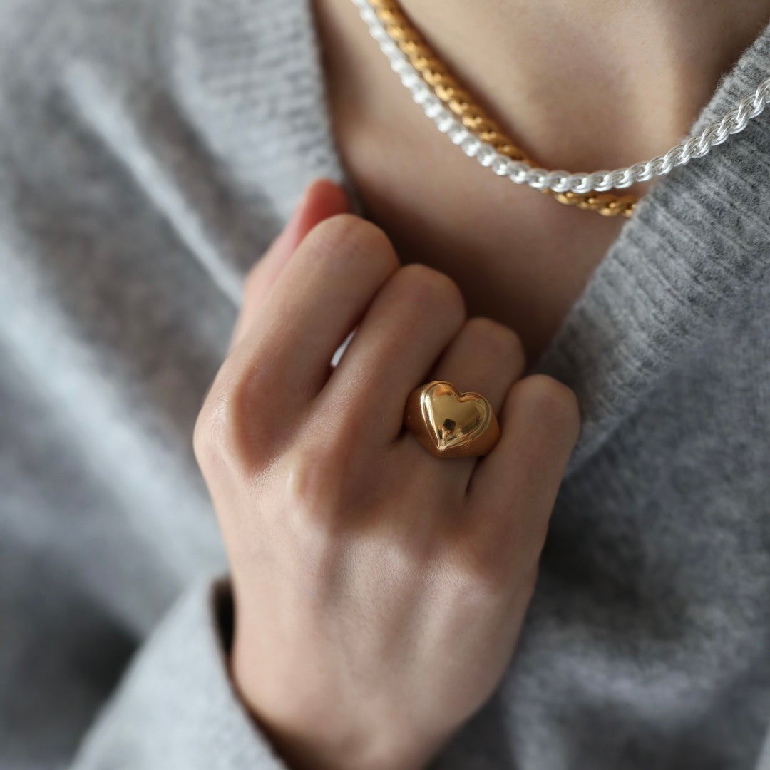 Sygnet projektowany ręcznie i odlany ze złota próby 585. Górna część ozdobiona wypukłym, gładkim motywem serca, kontrastującym z porowatą fakturą reszty powierzchni. Wnętrze pierścionka lekko wklęsłe, zapewniające komfort noszenia.