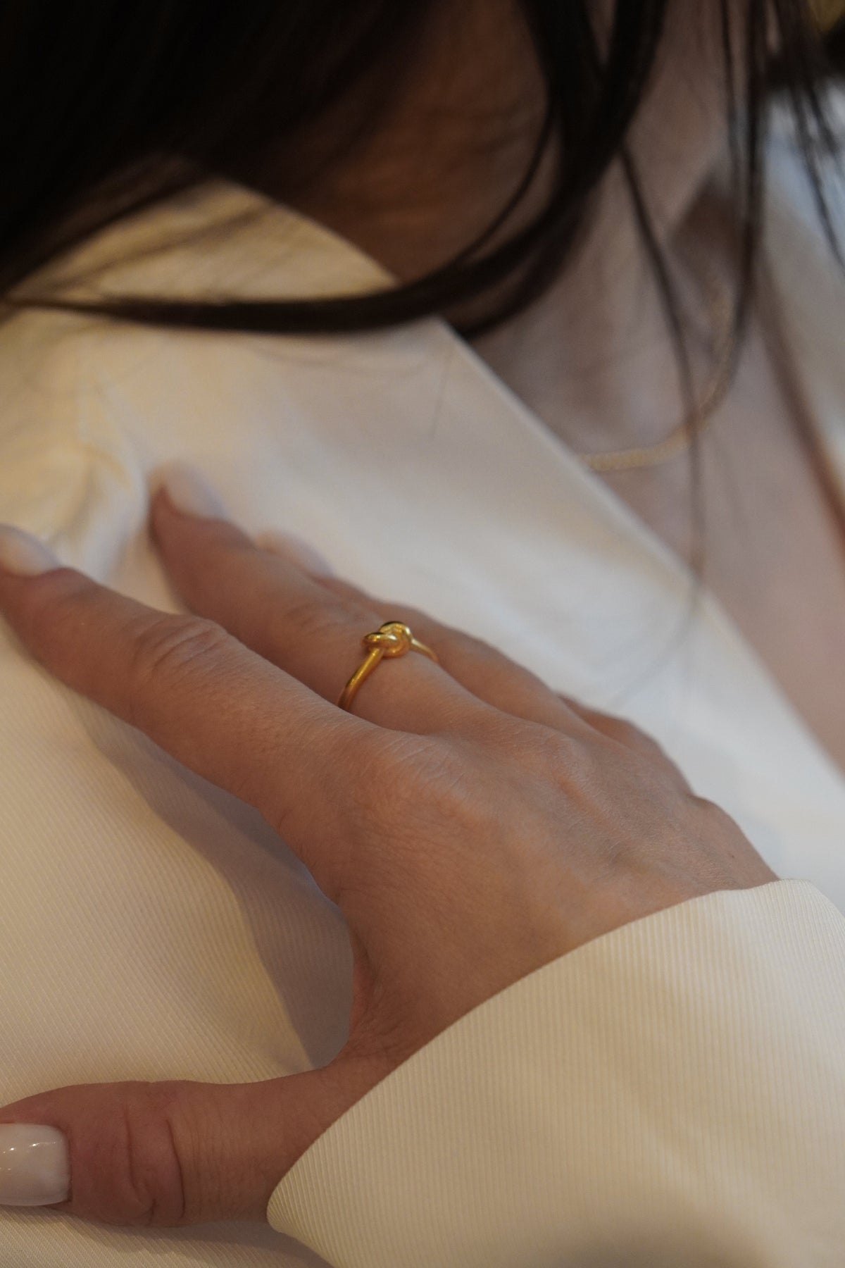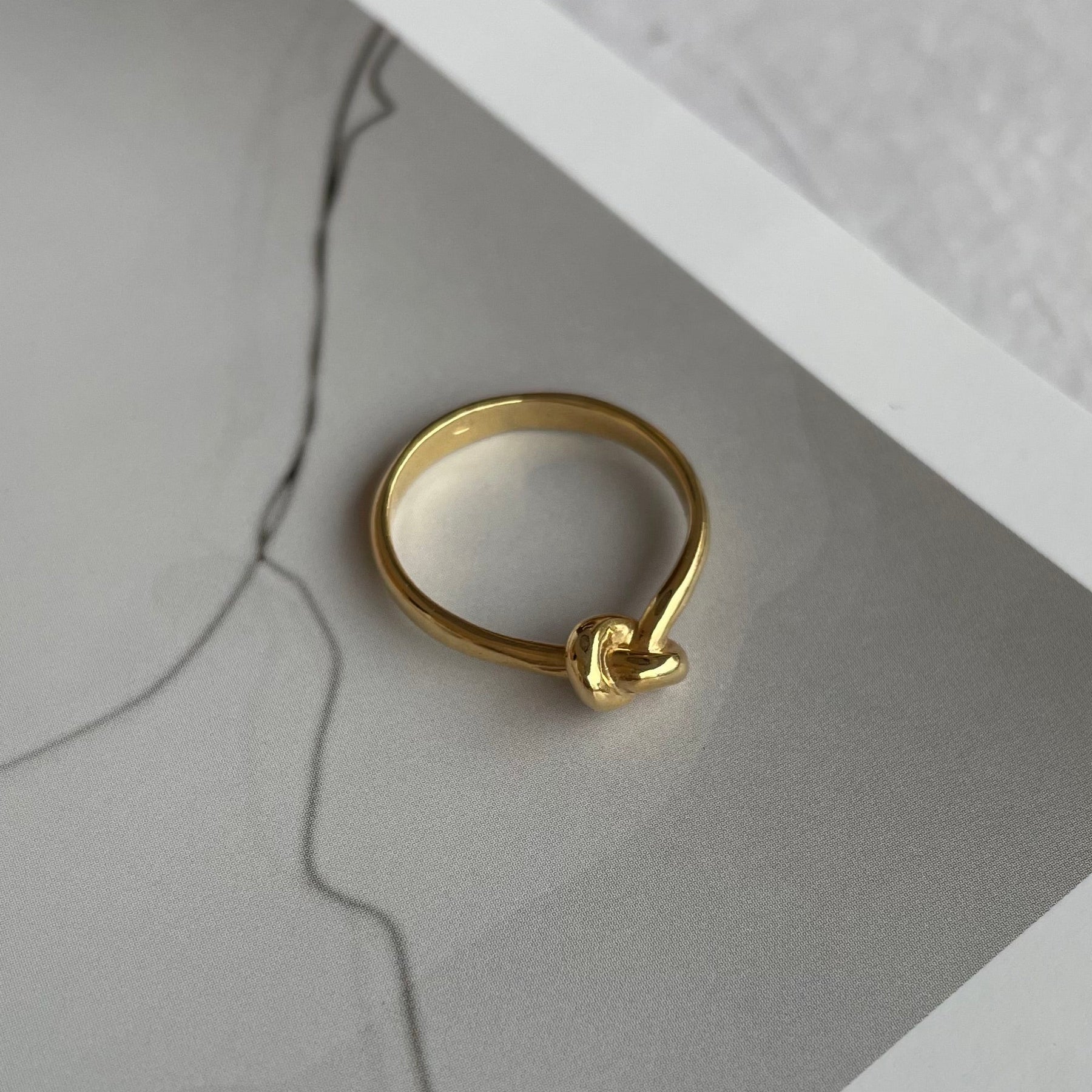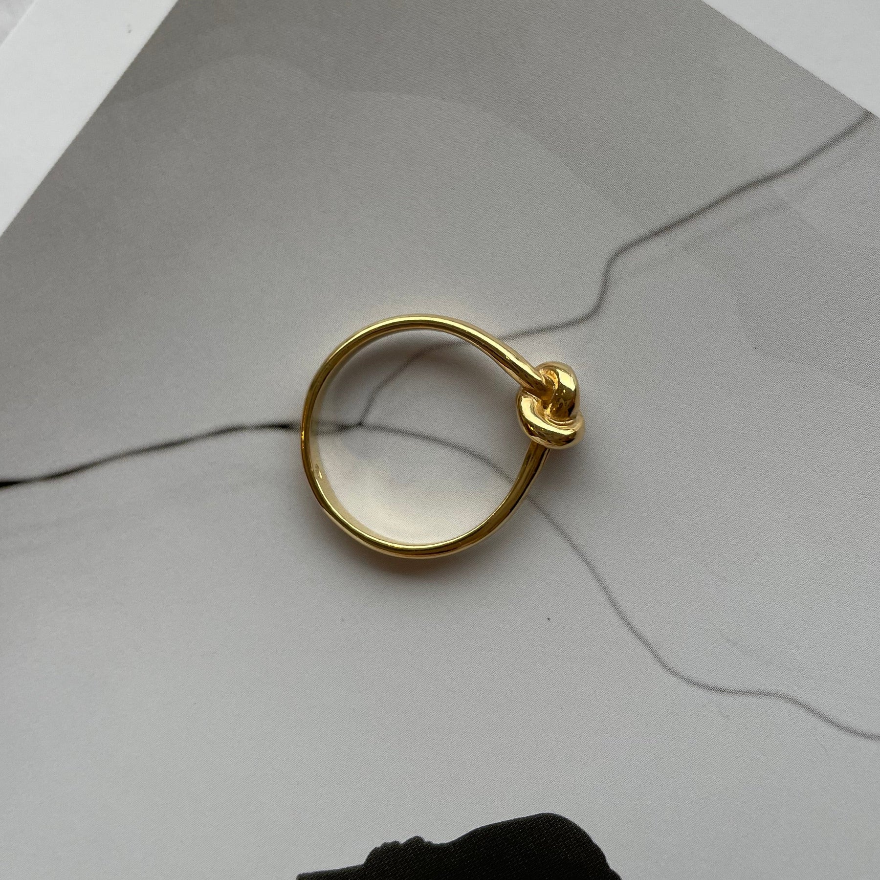 Pierścionek w całości wykonany ręcznie ze srebra próby 925, pokryty warstwą złota 24K. Konstrukcja oparta na otwartej formie z dekoracyjnym, symetrycznym węzłem. Powierzchnia polerowana, profil obrączki zaokrąglony.