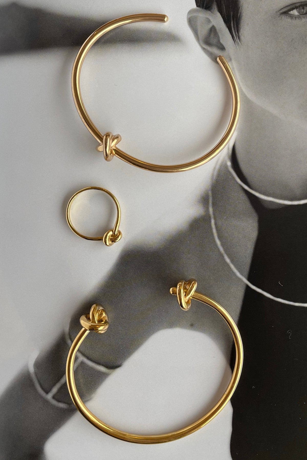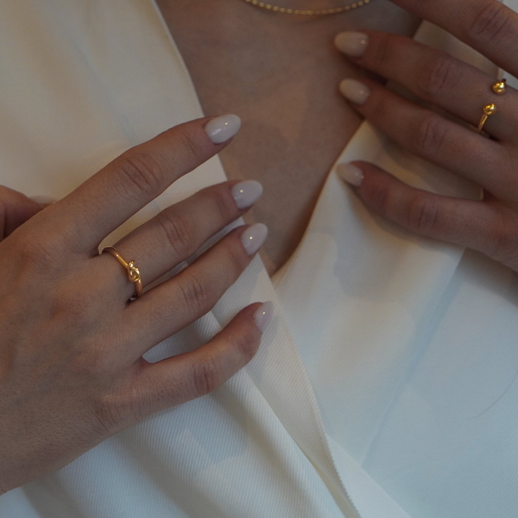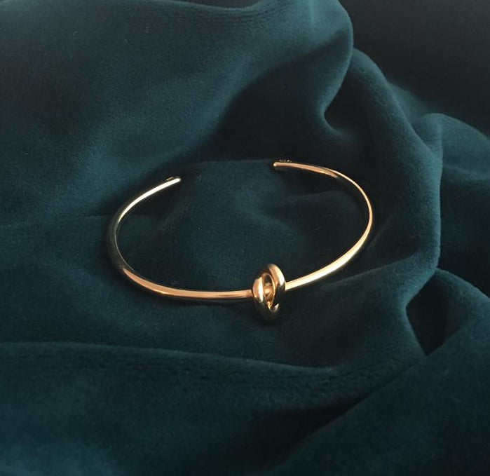 Pierścionek w całości wykonany ręcznie ze srebra próby 925, pokryty warstwą złota 24K. Konstrukcja oparta na otwartej formie z dekoracyjnym, symetrycznym węzłem. Powierzchnia polerowana, profil obrączki zaokrąglony.