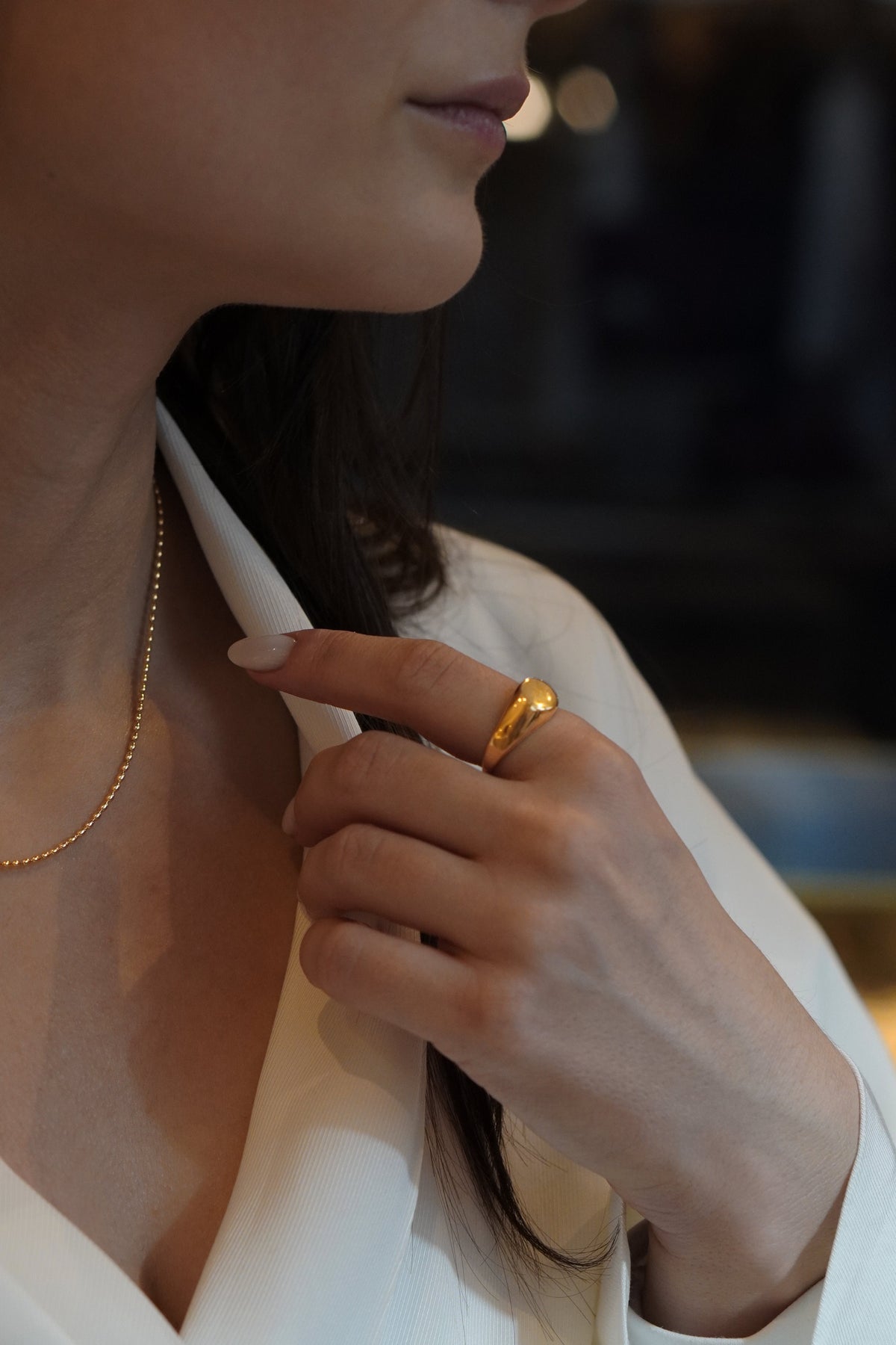 Mimo sygnetowego charakteru pierścionek nie jest masywny – został zaprojektowany tak, aby zachować lekkość i komfort noszenia. Minimalistyczna bryła i ręczne wykończenie podkreślają jego nowoczesny, elegancki charakter.
