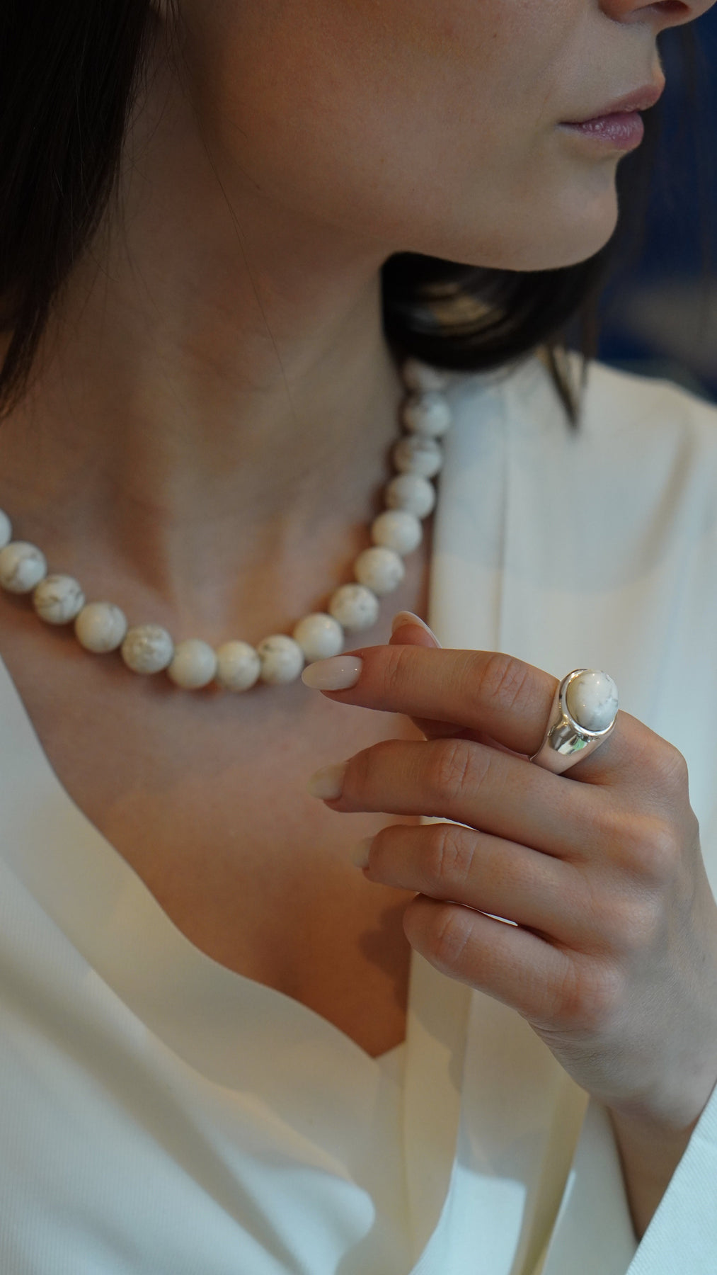 Grand Blanche – masywna, ale wyważona forma z chłodnego srebra, w której osadzony został naturalny howlit – kamień o mlecznej bieli, poprzecinanej delikatnym, grafitowym rysunkiem. Howlit od wieków kojarzony jest z wyciszeniem i równowagą – i właśnie ten nastrój wnosi do biżuterii: czysty, miękki, a jednocześnie niezwykle zdecydowany.
